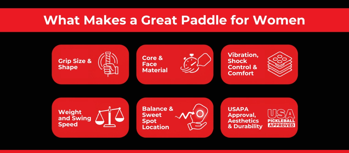 To rank among the best women’s pickleball paddle choices, a paddle should address several key factors that many competitors overlook. We’ll fill those content gaps here.