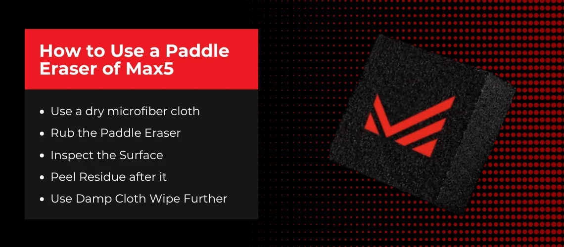 - Use MAX 5 Paddle Eraser: gentle circular rub over surface