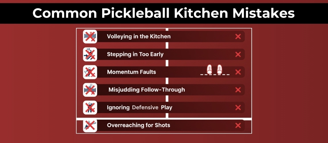 Many players fall into this mistake: volley from just outside the line, then their follow-through or momentum carries them forward into the kitchen. That’s a sure fault.